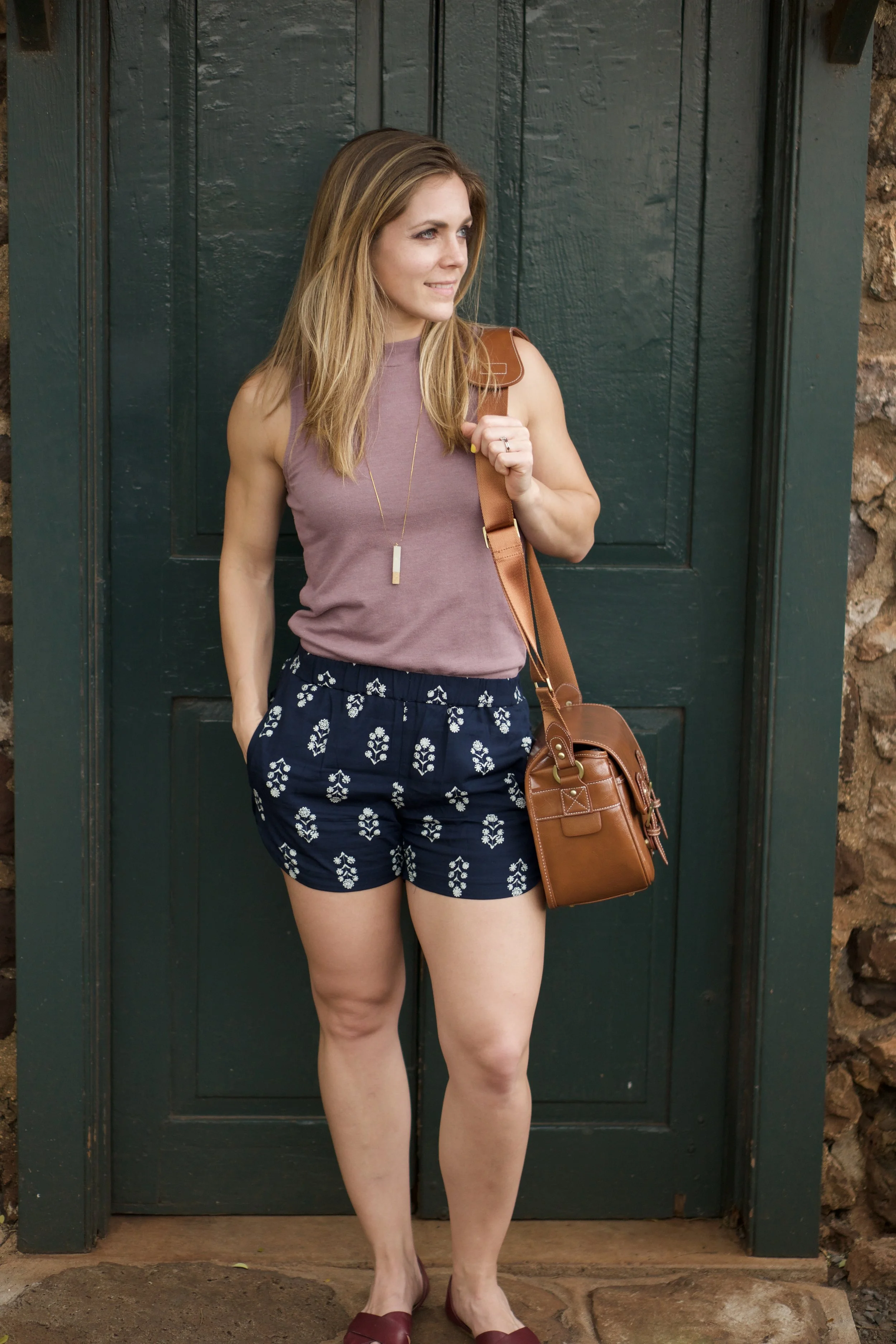 These shorts are what makes this outfit. I love them because they're loose fitting, thin material with (gasp) an elastic waist band! In the heat and humidity of the Hawaiian islands, this combination made for a perfect fit. The color and print make these shorts easy to pair--I've done gray, white, green, striped, solid, and on this occasion, yes, even purple. Basically, my advice is to treat these almost as a neutral option that goes with *just about* everything.